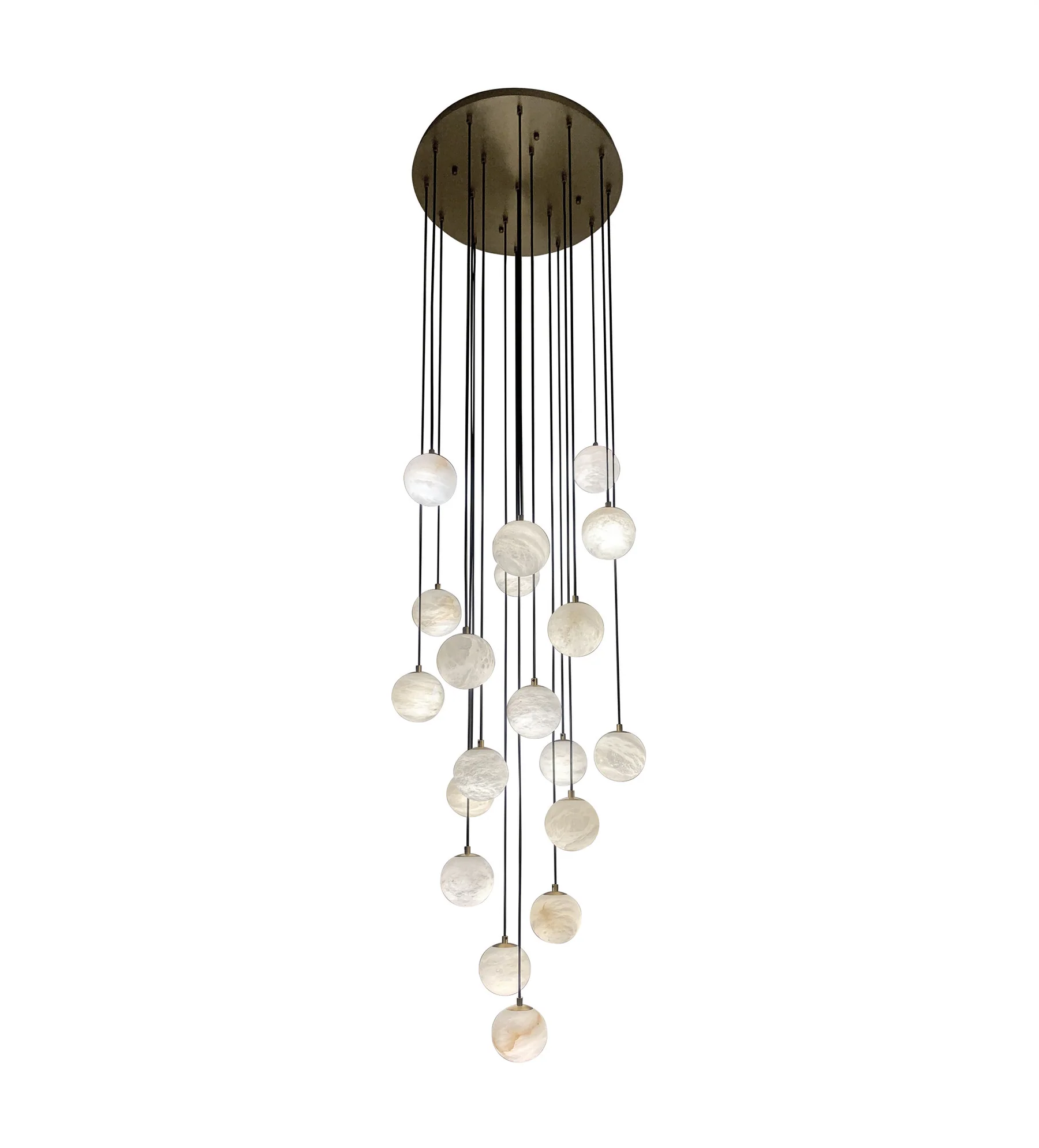 De CRACE-kroonluchter set van 19 is ontworpen om structuur, licht en materiaal in één centraal element te combineren.