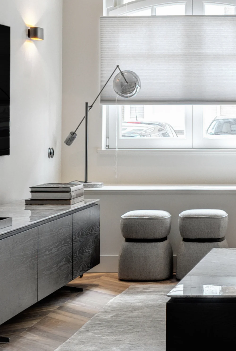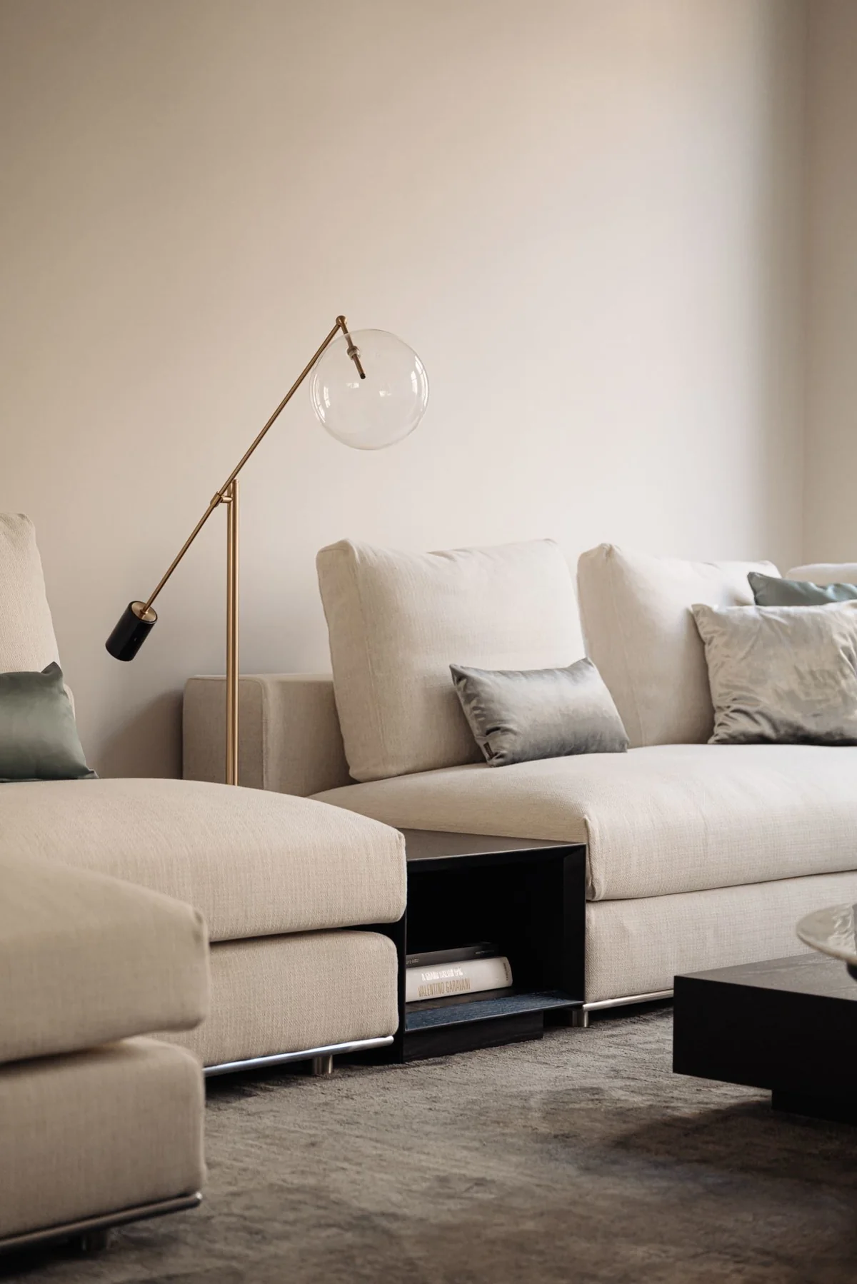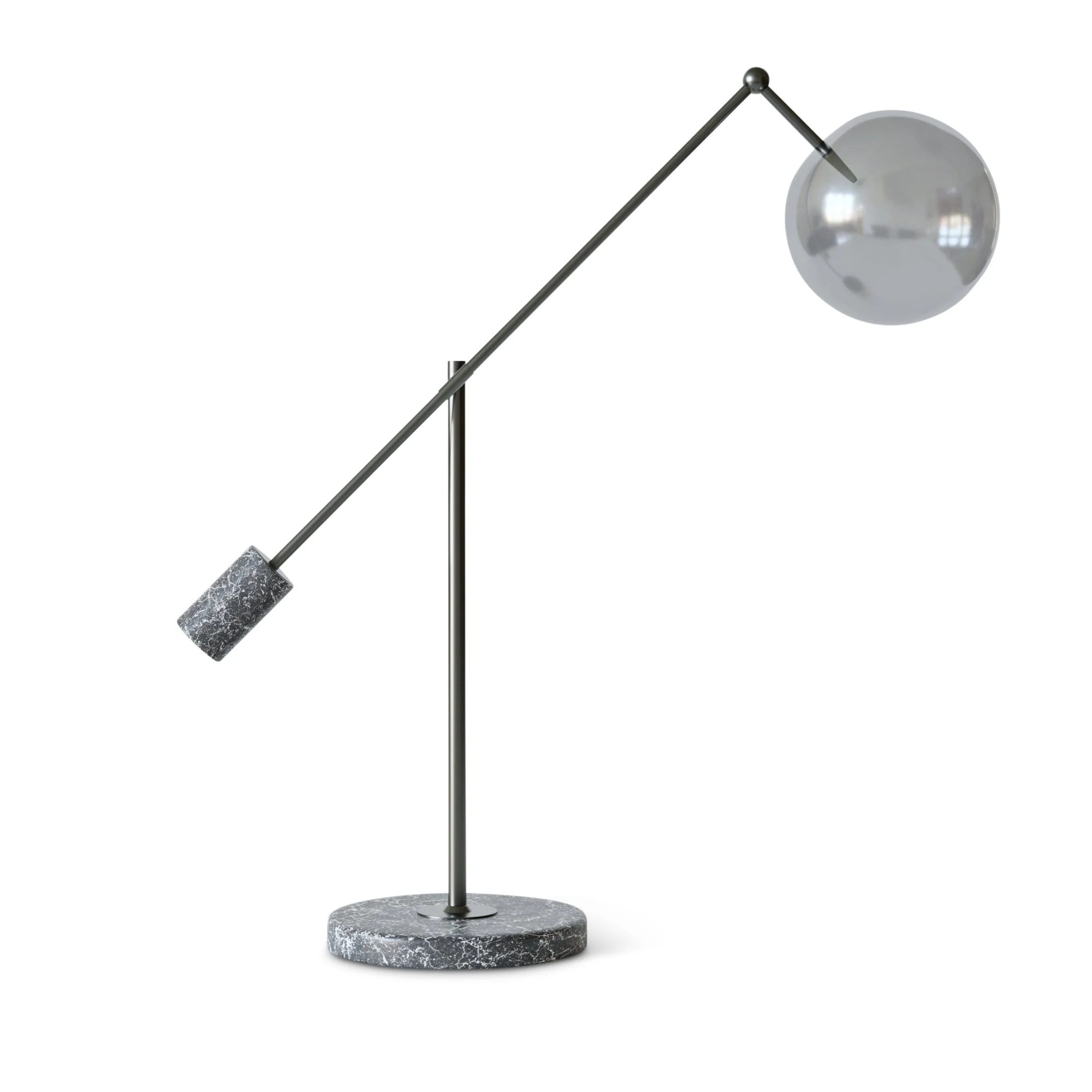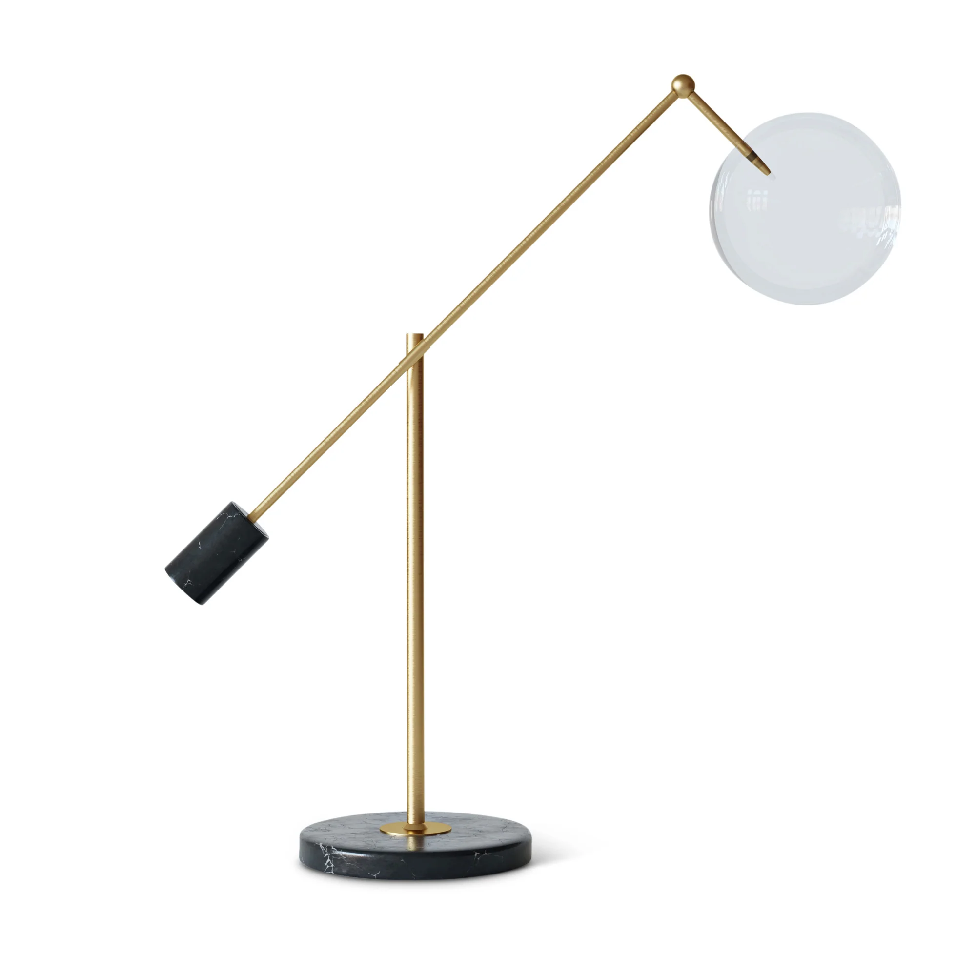 Hij is vervaardigd uit zwart marmer en glas, en afgewerkt in geborsteld messing en grijs. Het ontwerp richt zich op warm en comfortabel licht dat bijdraagt aan een ontspannen sfeer.