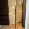 Vloerlamp die verticaliteit en zacht licht aan de ruimte toevoegt.