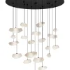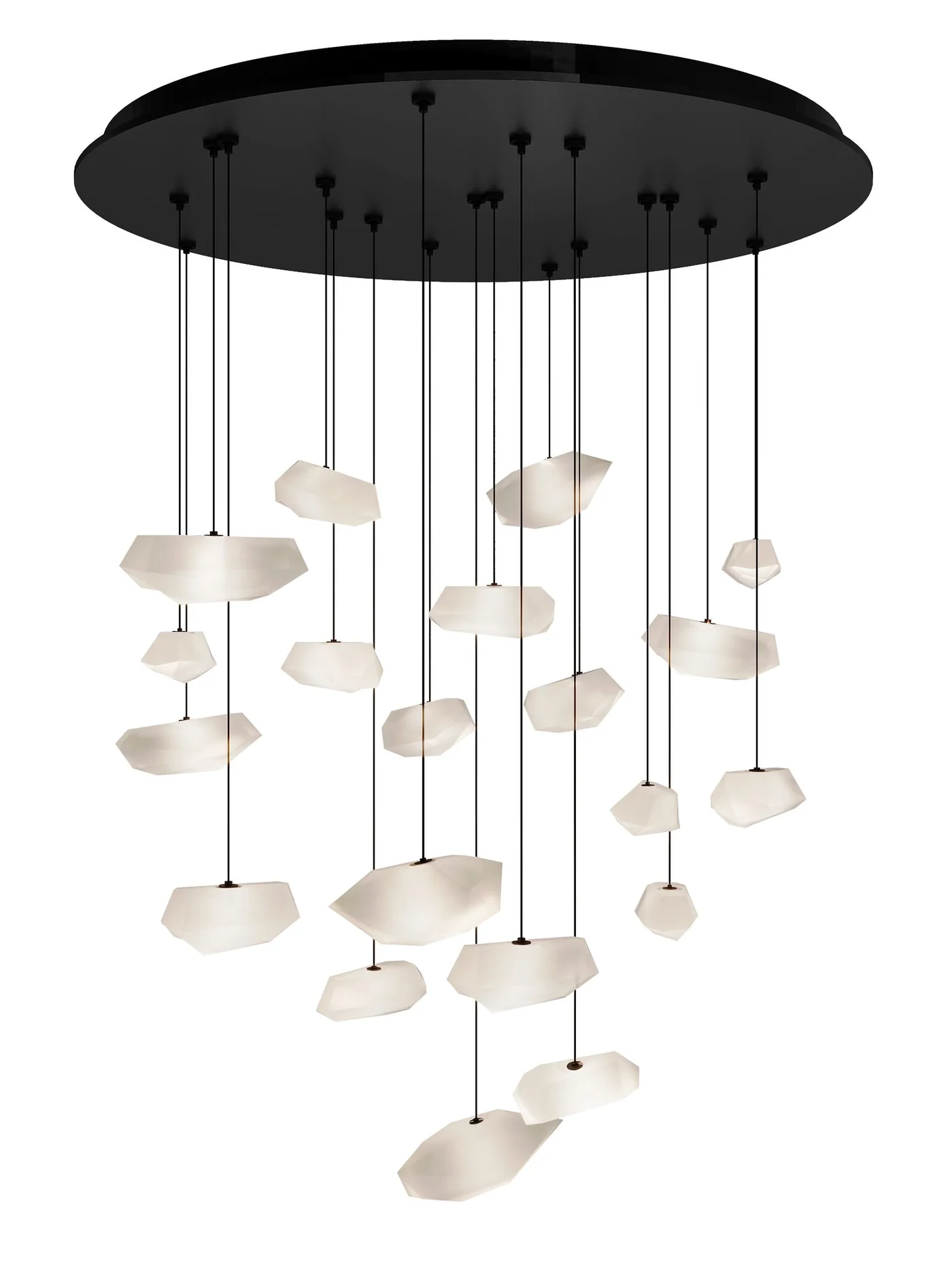De CHRYSTAL-kroonluchter met 19 lichtpunten is ontworpen om structuur, licht en materiaal in één centraal element te combineren.