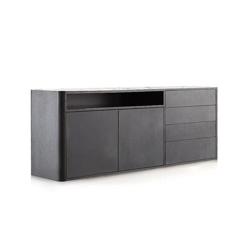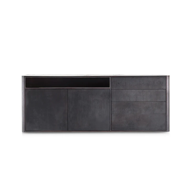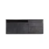 Hij is vervaardigd uit hout, roestvrij staal en keramiek. De voorkant blijft minimalistisch, zodat het meubel opbergruimte biedt zonder de ruimte te overheersen.