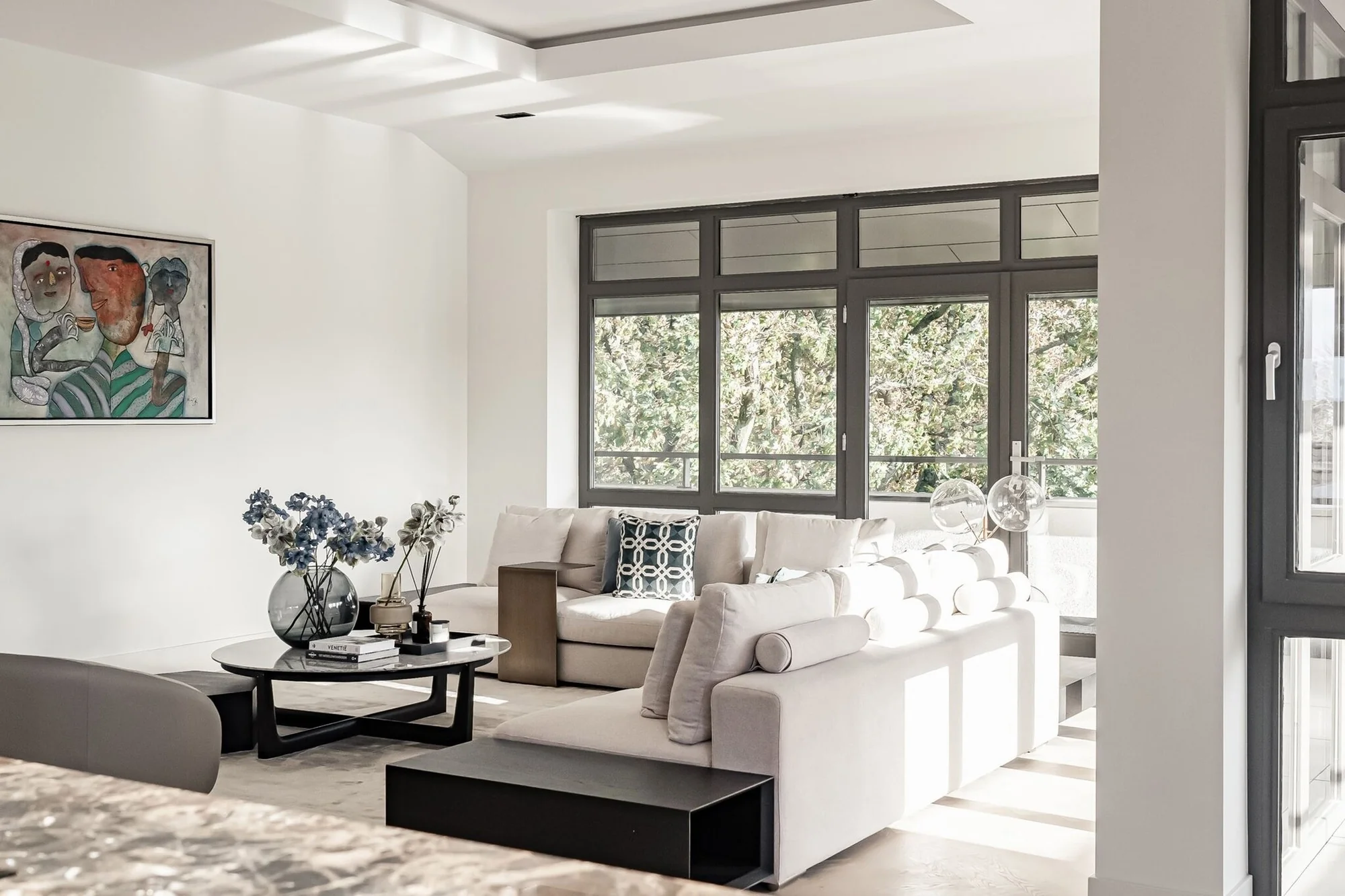 De tafel biedt een praktisch oppervlak voor alledaagse voorwerpen, terwijl hij een rustige visuele uitstraling behoudt, zodat de omringende meubels en materialen kunnen opvallen.