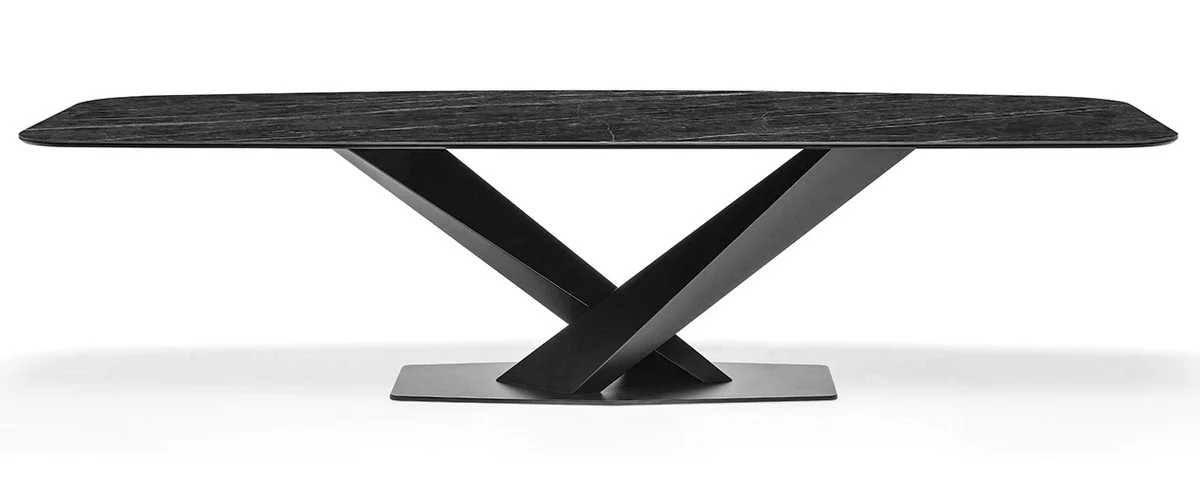 De tafel is vervaardigd uit marmer en roestvrij staal en afgewerkt in antraciet marmer. De strakke lijnen en uitgebalanceerde verhoudingen zorgen voor een rustige en gestructureerde uitstraling in de ruimte.